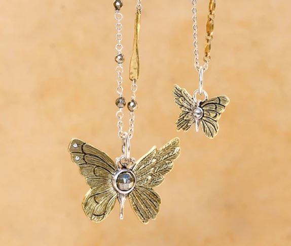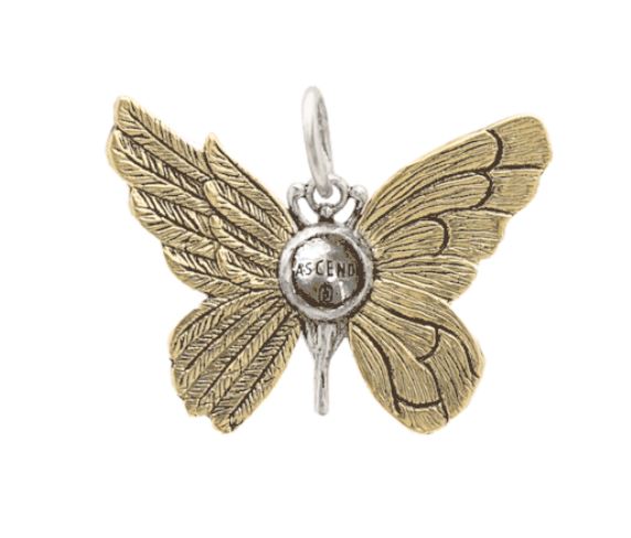 Cast in a combination of brass and sterling silver, our Ascension Butterfly Pyrite Charm is a smaller version of the pendant, featuring a custom-cut checkerboard pyrite center, flanked on one side by an angel wing, and the other side a butterfly wing. The reverse is etched with ASCEND. This sweet charm serves as a reminder of our dual nature, human and divine, and that we are always becoming, passing through time, connected to the great mystery of life.