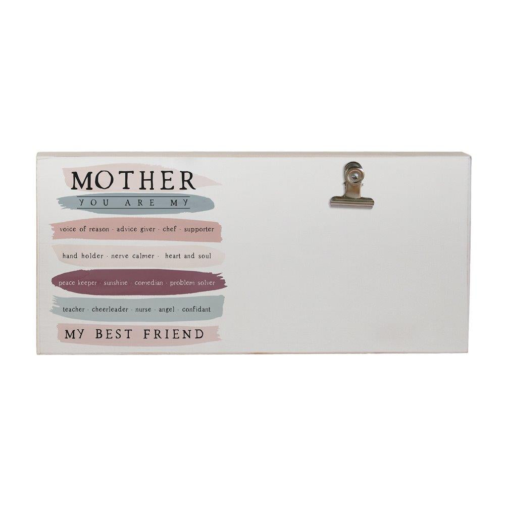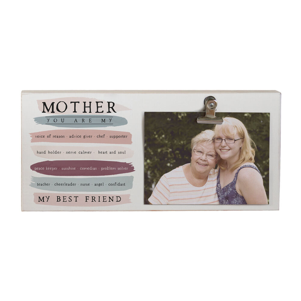 A handcrafted wooden plaque from SincereSurroundings, titled "Mother You Are My," features a photo clipboard and reads: "Mother, you are my voice of reason, advice giver, chef, supporter, hand holder, nerve calmer, heart and soul, peace keeper, sunshine, comedian, problem solver, teacher, cheerleader, nurse, angel confidant—my best friend.
