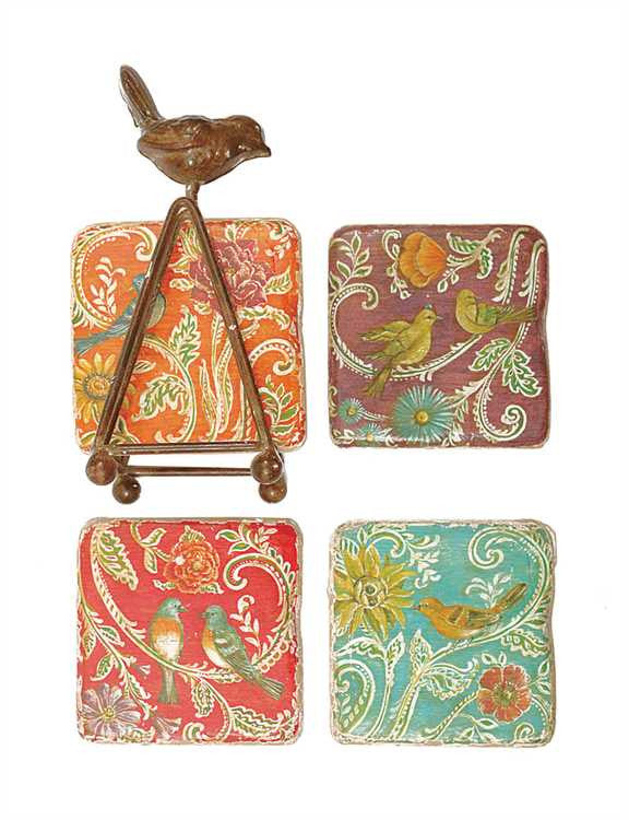 3-3/4" Square Resin Coasters w/ Bird Image & Metal Stand, Set of 4 plus stand.