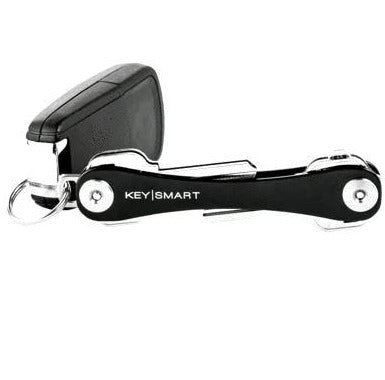 The KeySmart Key Holder, a compact black and silver organizer from KeySmart, efficiently maximizes pocket space while neatly accommodating several keys, including a sleek black car key fob.