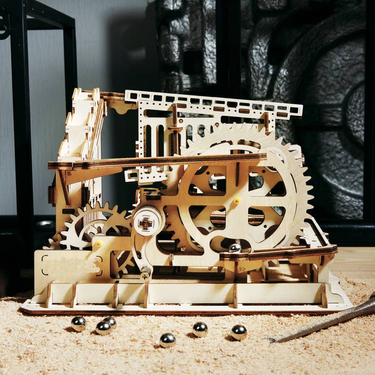 Marble Run, DIY Laser-Cut 3D Wooden Puzzle COG Coaster. Assembled Size: 254 x 232 x 165 mm. Package Size: 317 x 233 x 46 mm. Puzzle Pieces: 233 pcs.