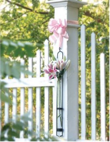 Featuring a versatile white wooden fence topped with an elegant pink ribbon bow, Couronne's Florence Tube Vase with Hanger Gift Box enhances the scene. Below, its unique design element—a metal holder crafted from recycled glass—cradles pink and white lilies against a lush backdrop of green foliage.