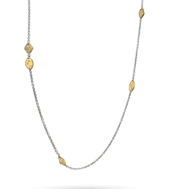 Glimmering oval and diamond shaped brass droplets, aglow with crystals, float weightless in the orbit of this delicate sterling silver rolo chain. In our Oval Star Scatter Chain, a pageant in the sky unfolds before our eyes, like glimpsing the sparks of atoms in flight or the radiant geometry of faroff burning suns. Revel in the stateliness of this chain, worn well on its own or layered. Create your own starry night by adding on sparkling charms and pendants.