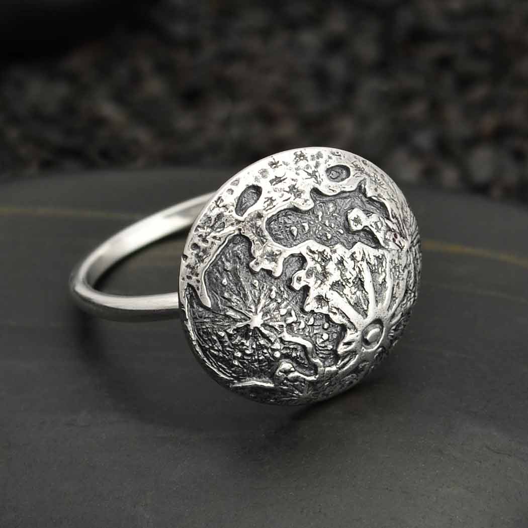 Bask in the light of the moon whenever you wear this sterling silver full moon ring. It is beautifully textured with peaks, valleys, and craters to evoke the surface of the moon. The slightly concave surface lends the piece dimension, even while the back is hollowed out to reduce weight. Every full moon casts an energetic vibe, making it a perfect time to be brave, try new things, throw parties, and make new friends.