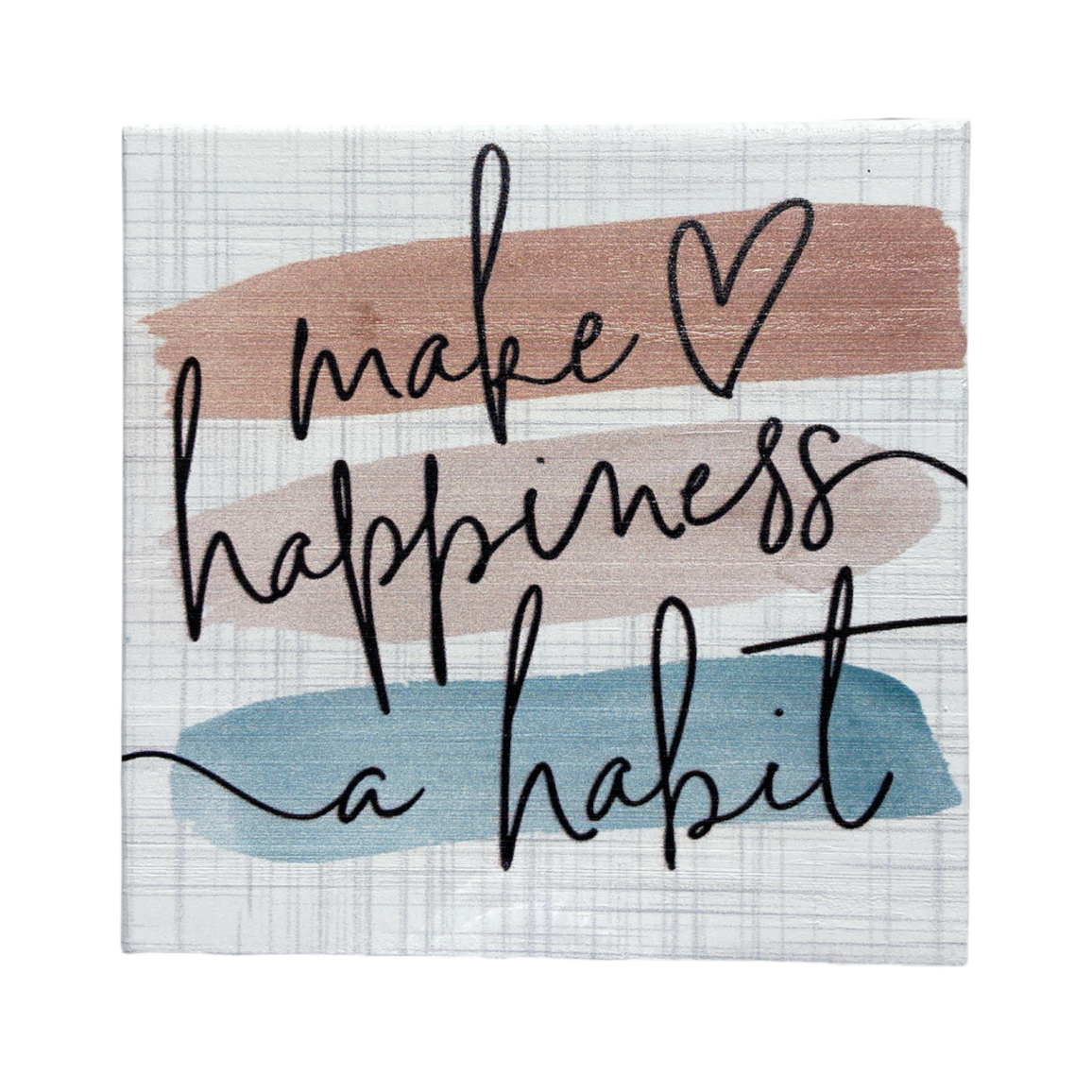 A handcrafted canvas from SincereSurroundings titled "Make Happiness" elegantly features the message "make happiness a habit" in black cursive over earthy tones of beige, brown, and blue. Ideal for a shelf display, the heart symbol replacing the dot in "i" adds charm to this piece originating from Rock Rapids, IA.