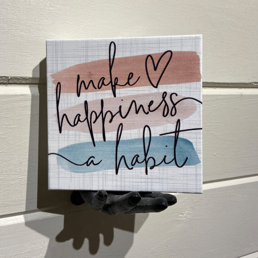 The "Make Happiness" sign by SincereSurroundings is a petite, handcrafted piece that showcases the phrase "make happiness a habit" in elegant cursive, with horizontal pink and blue brushstrokes. Ideal for shelf displays, it is set off beautifully by a dark, sculpted hand against a light-colored textured wall backdrop.