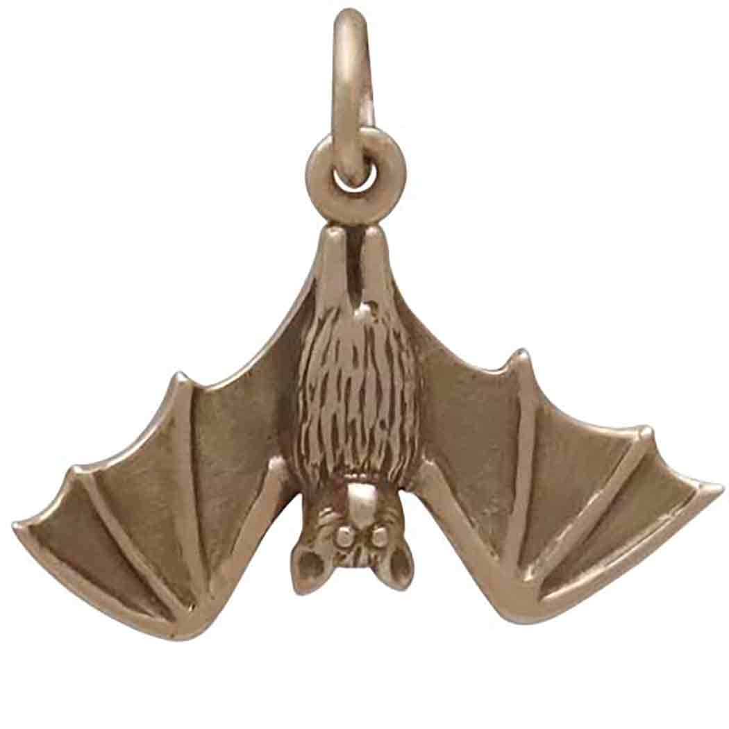 Bronze Realistic Hanging Bat Charm. With her wings spread wide, this cave dweller is a creature of the night. Due to their keen senses, bats symbolize intuition, dreams, and visions to many cultures. And, though not known for their charm & warmth, bats are very nurturing, exhibit verbal communication, touching, and sensitivity to members of their group. Includes 5mm soldered jump ring.