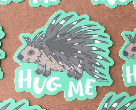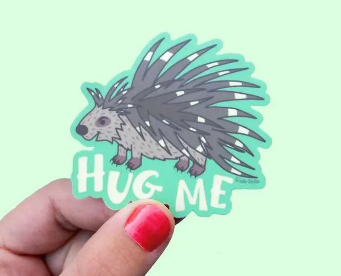 Sticker featuring a cartoon porcupine with a friendly expression and dark quills, placed on a brown background with a green outline. The vinyl sticker from Lucky Sardine includes the text "Hug Me" below and offers multiple water-resistant copies for long-lasting appeal.